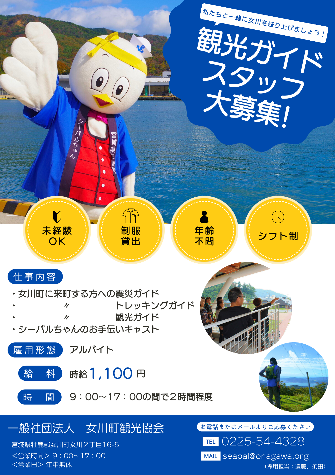 現在、女川町観光協会では【観光ガイドスタッフ】【シーパルちゃんのお手伝いキャスト】を募集しています 観光協会では女川町を訪れた観光客の皆さまに観光案内所での観光・イベント情報のご案内や、 震災の記憶を風…