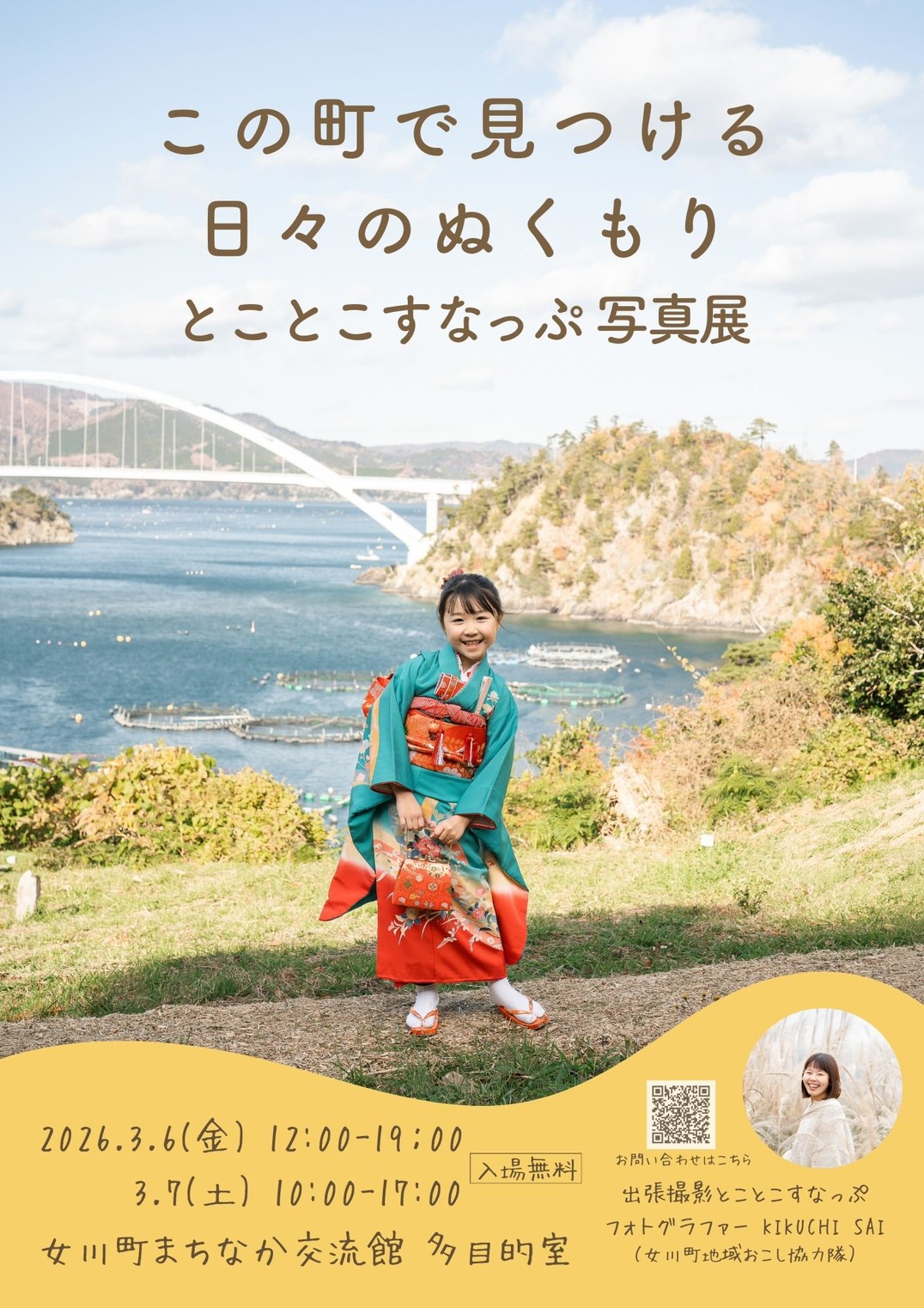 女川町で地域おこし協力隊として活動する菊地 彩さんの写真展が行われます。 菊地さんが普段活動している出島にある出島遺跡から撮影されたというポスターの写真とっても素敵ですね…! 七五三記念の撮影での1枚とのこ…