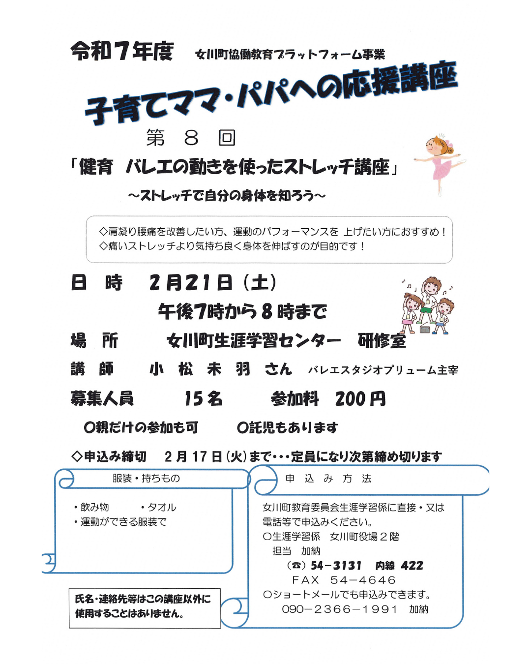 2月21日(土)、第8回「子育てママ・パパへの応援講座」が開催されます。 肩こり、腰痛にお悩みの方必見!バレエの動きでお悩みの改善、運動パフォーマンスの向上にも! 託児もありますので、ぜひ親子でもご参加ください♪ 日…