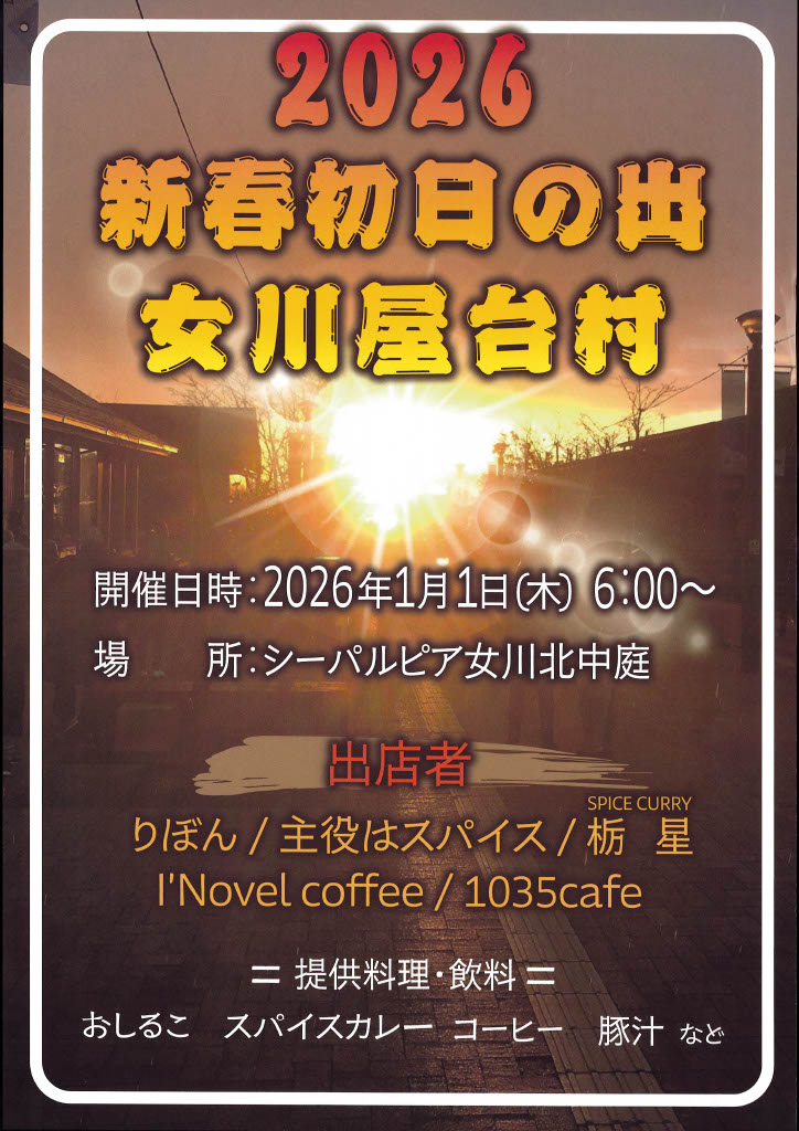 毎年多くの方が訪れる道の駅おながわレンガ道からの初日の出。 今年も女川屋台村が皆様を温かい食べ物、ドリンクでお出迎えいたします。 お越しの際はぜひお立ち寄りください。