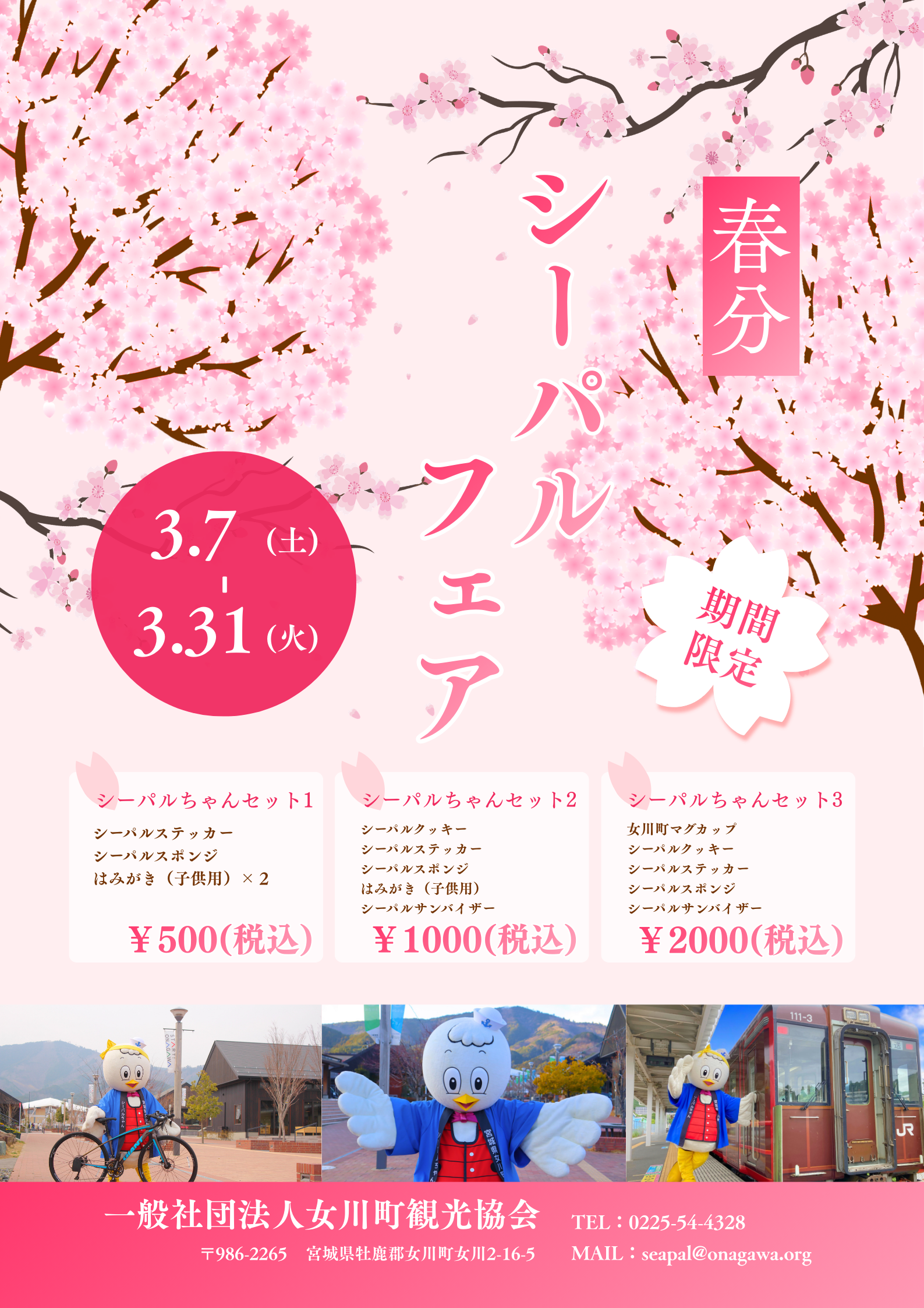 ただいま女川町観光協会では、「春のシーパルフェア」を開催しています。 期間は3月7日(土)~3月31日(火)までの期間限定です。 シーパルちゃんグッズをお得に楽しめるセットをご用意しました。 ステッカーやスポンジ、クッキ…