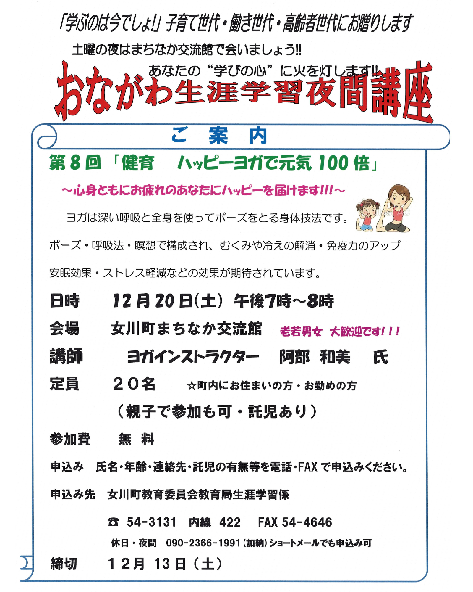 12月20日(土)、第8回「おながわ生涯学習夜間講座」が開催されます。 ヨガインストラクターと一緒に本格的なヨガを楽しみましょう! むくみや冷えの解消、免疫力アップなどこれからの季節を乗り切るためにも効果的です。 参加は…