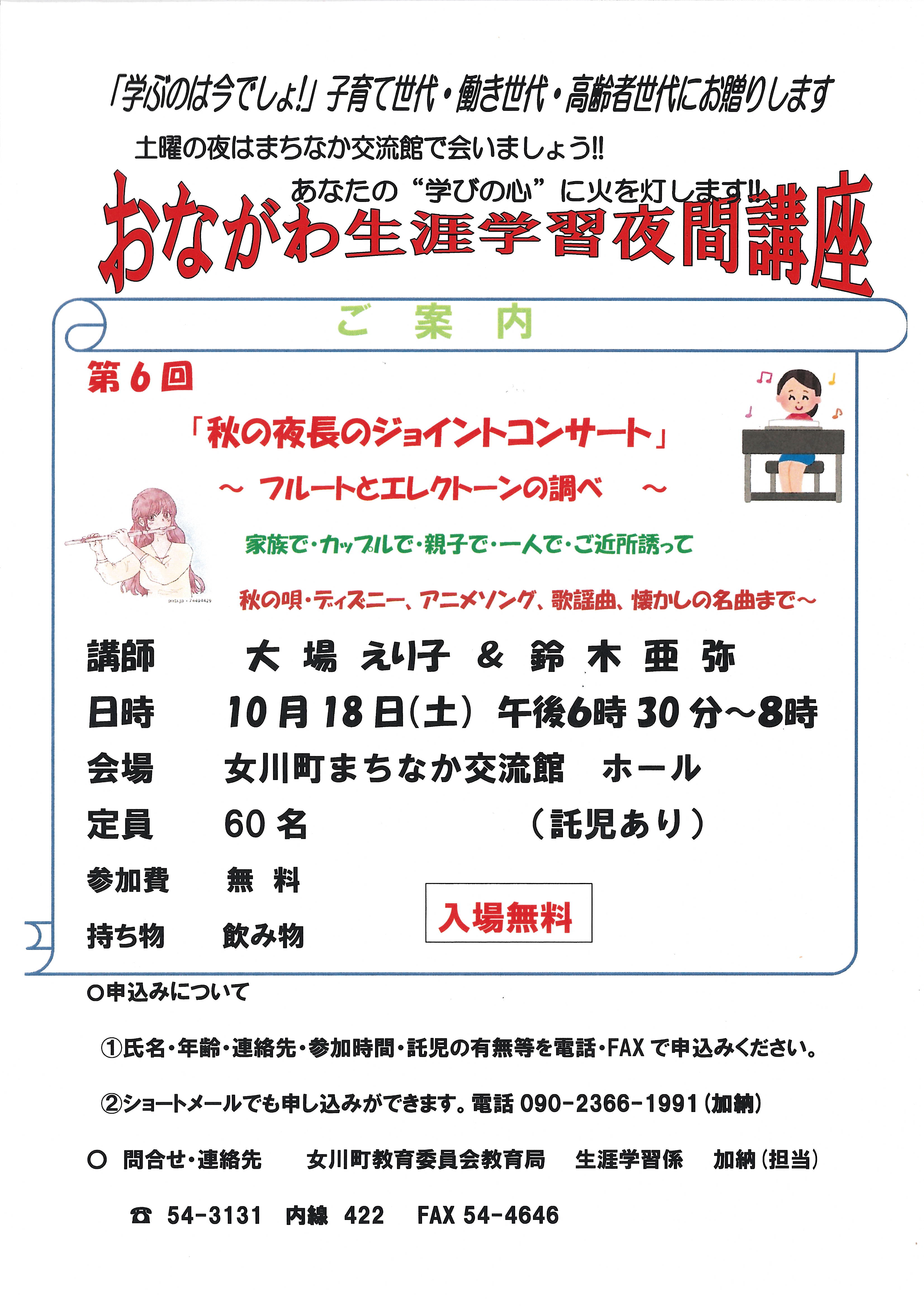 第6回おながわ生涯学習夜間講座「秋の夜長のジョイントコンサート」のお知らせです。 秋の唄、ディズニーやアニメソング、懐かしの歌謡曲まで幅広く演奏予定。 ご家族やご友人、カップルでのご来場も大歓迎です。 開催概要 日時: …