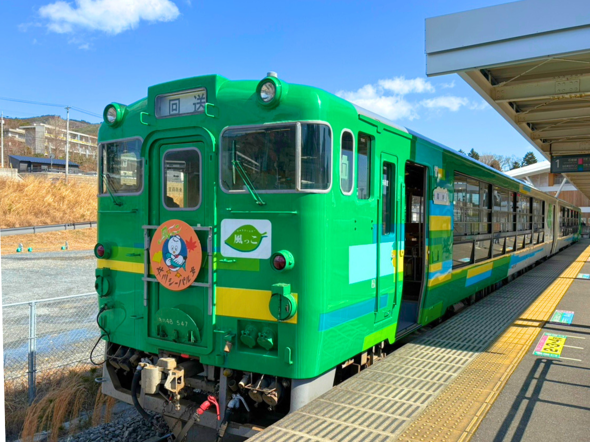 JR春の臨時列車「風っこ女川シーパル号」が女川駅にやって来ました! 今日は風こそ強いものの寒さもそこまで厳しくなく青空が広がりました。 青空と緑色の車両のコントラストが映えますね。 1月に来たストーブ号と車両デザインは同…
