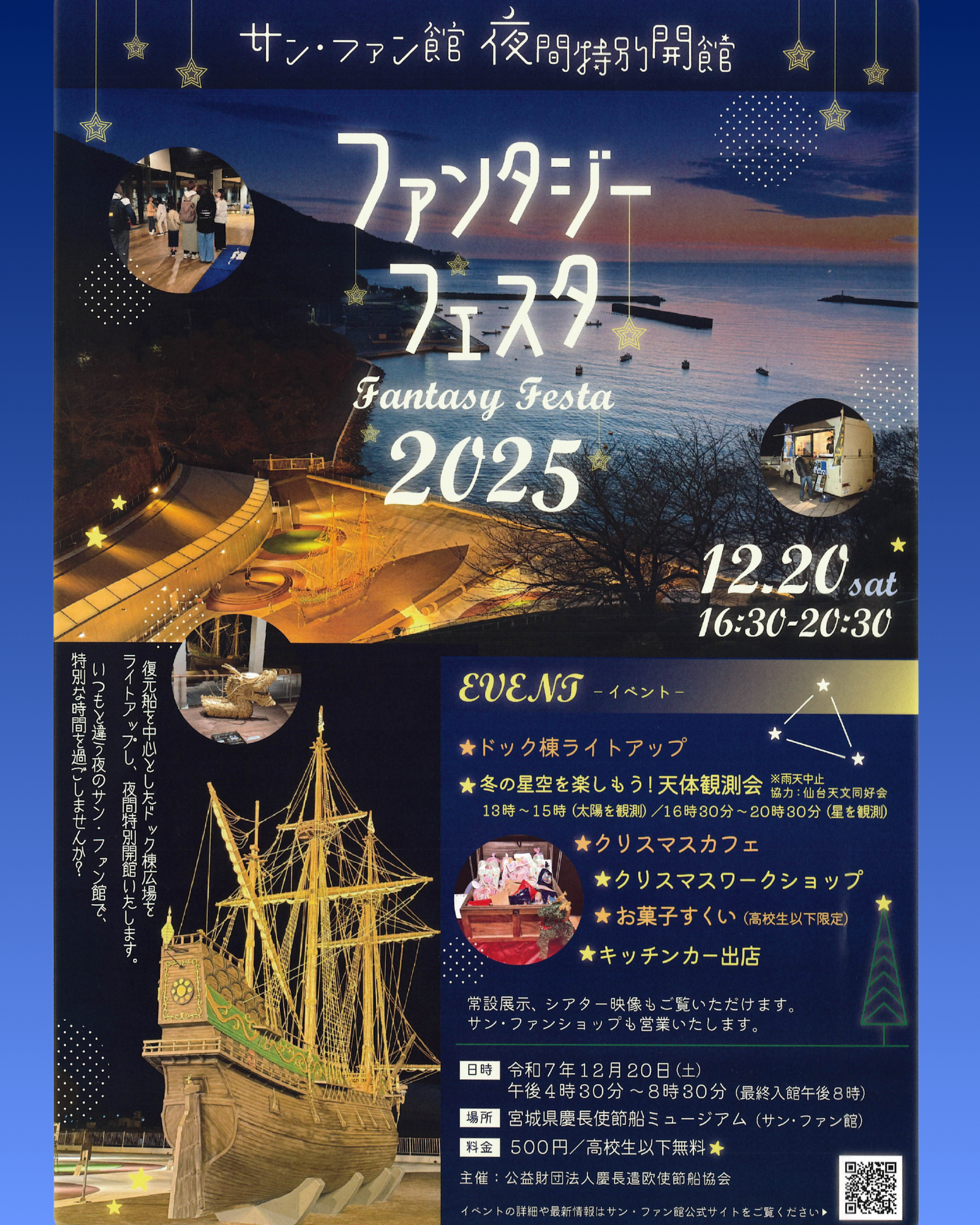 12月20日(土)サン・ファン館でファンタジーフェスタ2025が開催されます。 ライトアップされた、いつもと違うサン・ファン館で特別な時間を過ごしてみませんか? 日時 2025年12月20日(土) 16:00~20:30…