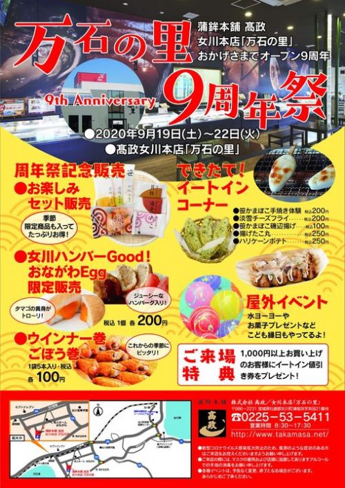 おながわブログ イベント情報 街なかレポート おながわ日記 蒲鉾本舗髙政女川本店 周年祭のおしらせ イベント情報 ブログ/2020年9月19日 女川本店 万石の里が今年で9周年を迎えました。 皆様へ日頃の感謝を込めて 万石の里 周年祭を開催いたします。 今年は『お楽しみセット』や、『おながわEgg』、 これからの季節にぴったりな 『ウインナー巻・ごぼう巻』など 周年祭ならではの珍しい商品も販売いたします♪ 近くにいらした際は、ぜひお立ち寄りください。 ____________________ 開催期間:9月19日(土)~9月22日(火) ____________________ ←鹿の駆除実施について 第6回 お地蔵様の市→ こちらの記事もどうぞ『まるごと金華山歩』に参加してみませんか?映画「サンマとカタール」試写会雪かきワッショイ!女川温泉ゆぽっぽ まちびらき記念企画第2弾!