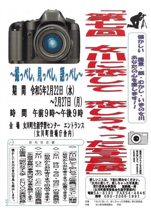 おながわブログ イベント情報 街なかレポート おながわ日記 第7回 女川に恋して 恋しちゃった写真展 イベント情報 ブログ/2023年2月2日 第7回 女川に恋して 恋しちゃった写真展 展示期間:令和5年2月22日(水)~2月27日(月) 展示時間:午前9時~午後9時 会場:女川町生涯学習センター エントランス(女川町役場庁舎内) お問合せ先: 「女川に恋して、恋しちゃった写真展」実行委員会事務局 加納純一郎 (女川町教育委員会 生涯学習課内) 電話:0225-54-3131 FAX:0225-54-4646 携帯:090-2366-1991 ←第7回 女川に恋して 恋しちゃった写真コンテスト 牡鹿半島一周チャレンジライド2023→ こちらの記事もどうぞ『まるごと金華山歩』に参加してみませんか?映画「サンマとカタール」試写会雪かきワッショイ!女川温泉ゆぽっぽ まちびらき記念企画第2弾!