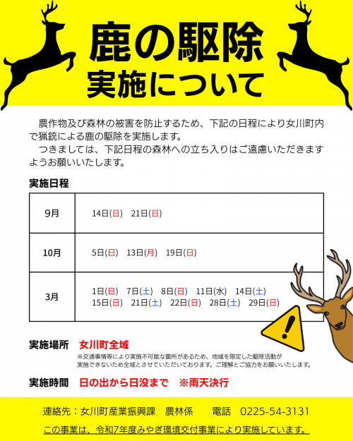 おながわブログ イベント情報 街なかレポート おながわ日記 【お知らせ】鹿の駆除実施について おながわ日記 ブログ/2025年8月20日 農作物や森林の被害を防止するため、下記日程で女川町全域において猟銃による鹿の駆除が行われます。 当日は安全確保のため、森林への立ち入りはご遠慮いただきますようお願いいたします。 実施日程:令和6年9月、10月、令和7年3月(詳細は画像参照) 実施場所:女川町全域 実施時間:日の出から日没まで(雨天決行) ご理解とご協力をよろしくお願いいたします。 (お問い合わせ先:女川町産業振興課 農林係 TEL 0225-54-3131) ←女川町のお土産に新商品が登場! 抽選で鹿角が当たる!「鹿の角切り行事」が開催されます→ こちらの記事もどうぞ蒲鉾本舗 高政 本店「万石の里」秋の感謝祭のお知らせ久々の「 どんより 」です。復幸祭が明けて、穏やかな女川町です!雨の女川の風景