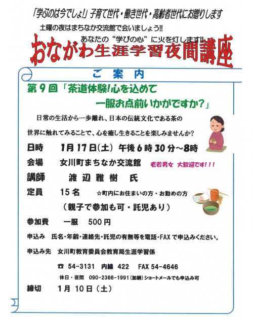 1月17日(土)、第9回「おながわ生涯学習夜間講座」が開催されます。