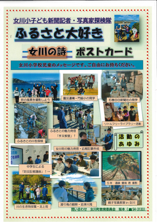 おながわブログ イベント情報 街なかレポート おながわ日記 女川のポストカード 配布中! おながわ日記 ブログ/2026年2月17日 女川小子ども新聞記者・写真探検隊の子どもたちが制作した「女川のポストカード」を、旅の情報館ぷらっとにて無料配布中です。 子どもたちならではの視点で切り取られた女川の風景は、どれも魅力にあふれています。大人が見慣れた景色も、少し違って見えるかもしれません。 旅の情報館ぷらっとは、毎日9:00~17:00までご利用いただけます。 気になる方は、ぜひお気軽にお立ち寄りいただき、ご自由にお持ちください。 ←いよいよ明日はONAGAWACK初日! こちらの記事もどうぞ復幸祭が明けて、穏やかな女川町です!天皇陛下と桜とオナガワニ サクラ サク!!震災から5年目