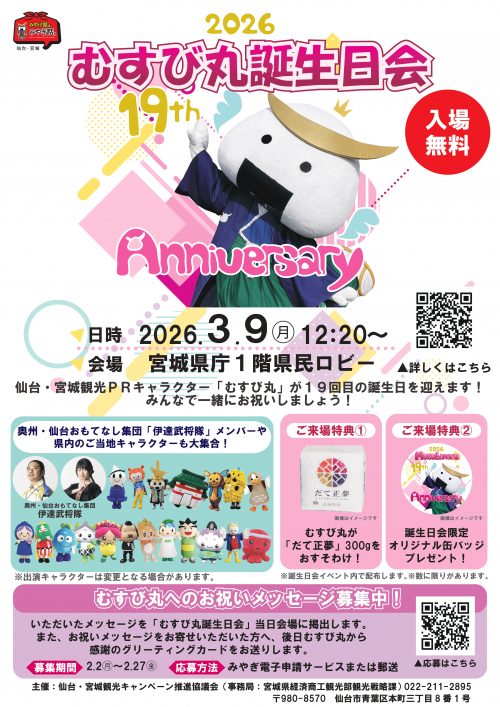 仙台・宮城観光PRキャラクター「むすび丸」が19回目の誕生日を迎えます。