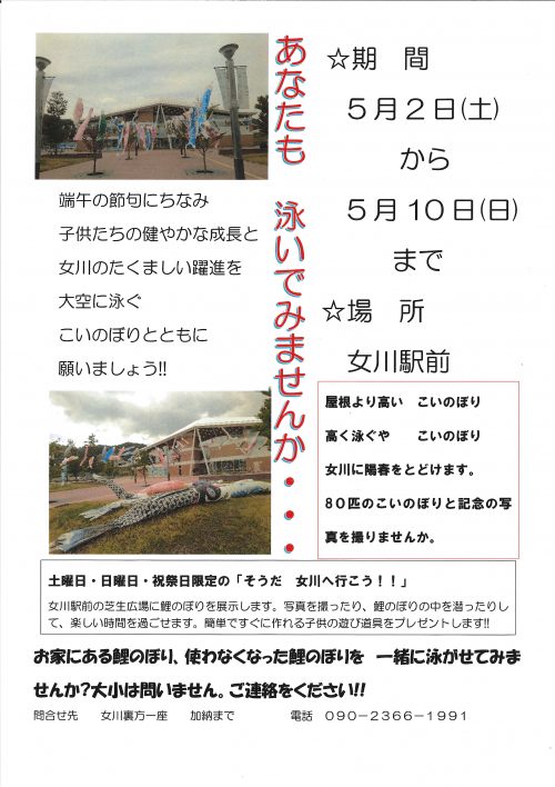 おながわブログ イベント情報 街なかレポート おながわ日記 鯉のぼりが女川の空を泳ぐ! イベント情報 ブログ/2026年4月14日 5月2日(土)から5月10日(日)まで、JR女川駅前にて鯉のぼりを掲揚します。 期間中の土日祝日には、イベント「そうだ、女川へ行こう!!」 を開催! JR女川駅前の芝生広場に、色とりどりの鯉のぼりが登場します。 写真を撮ったり、鯉のぼりの中をくぐったり、思い思いにお楽しみください。 また、「自宅に眠っている鯉のぼりがある」という方は、ぜひご連絡ください。 皆さまの鯉のぼりを、女川の空に一緒に泳がせてみませんか? お問い合わせ先 女川裏方一座 加納 TEL:090-2366-1991 ←「ご当地キャラ成田詣うなふぁん2026」にシーパルちゃんの出演が決まりました! こちらの記事もどうぞ安田智彦グループ ジャズコンサート in 女川 開催!【イベントのお知らせ】セボラ・アフタヌーンライブエアロビクスを満喫しよう!!ワークショップ開催のお知らせ