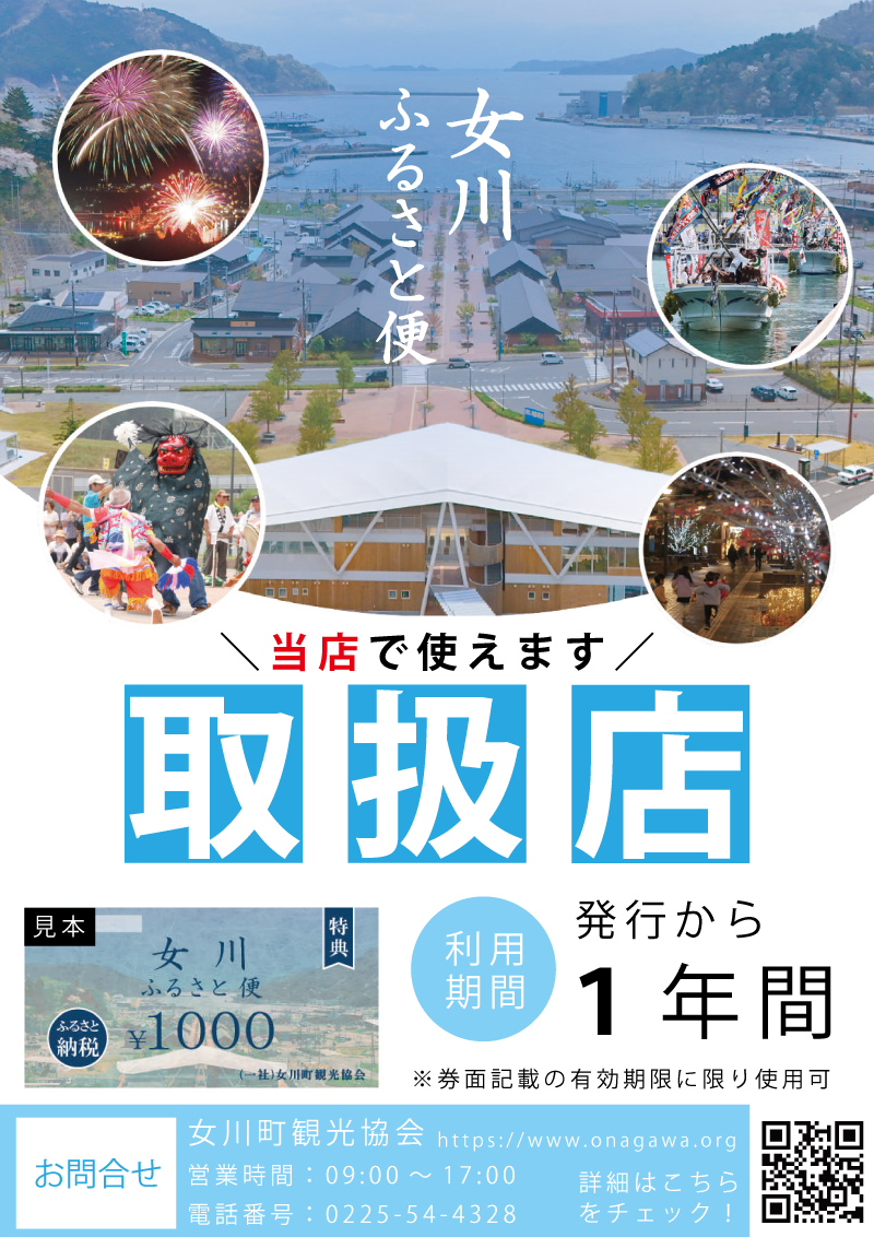 - 女川ふるさと便の特別取扱店舗で使用できるクーポンは、女川町内で使用できる通常の「おながわふるさと便」とは異なります。