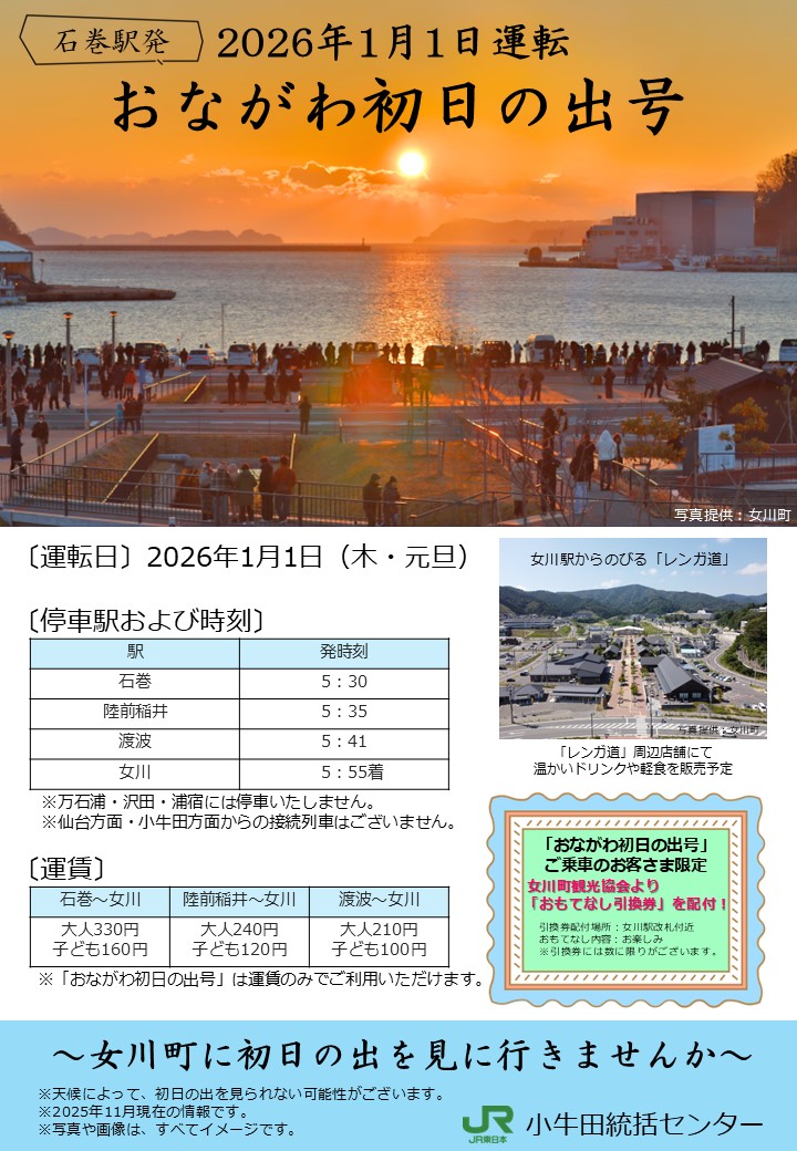 女川町で初日の出をご覧にお越しの際は、ぜひJR「おながわ初日の出号」をご利用ください! 当日ご乗車のお客様限定で、観光協会からおもてなしをご用意してお待ちしております。 また周辺店舗では、初日の出に合わせてドリンク等…