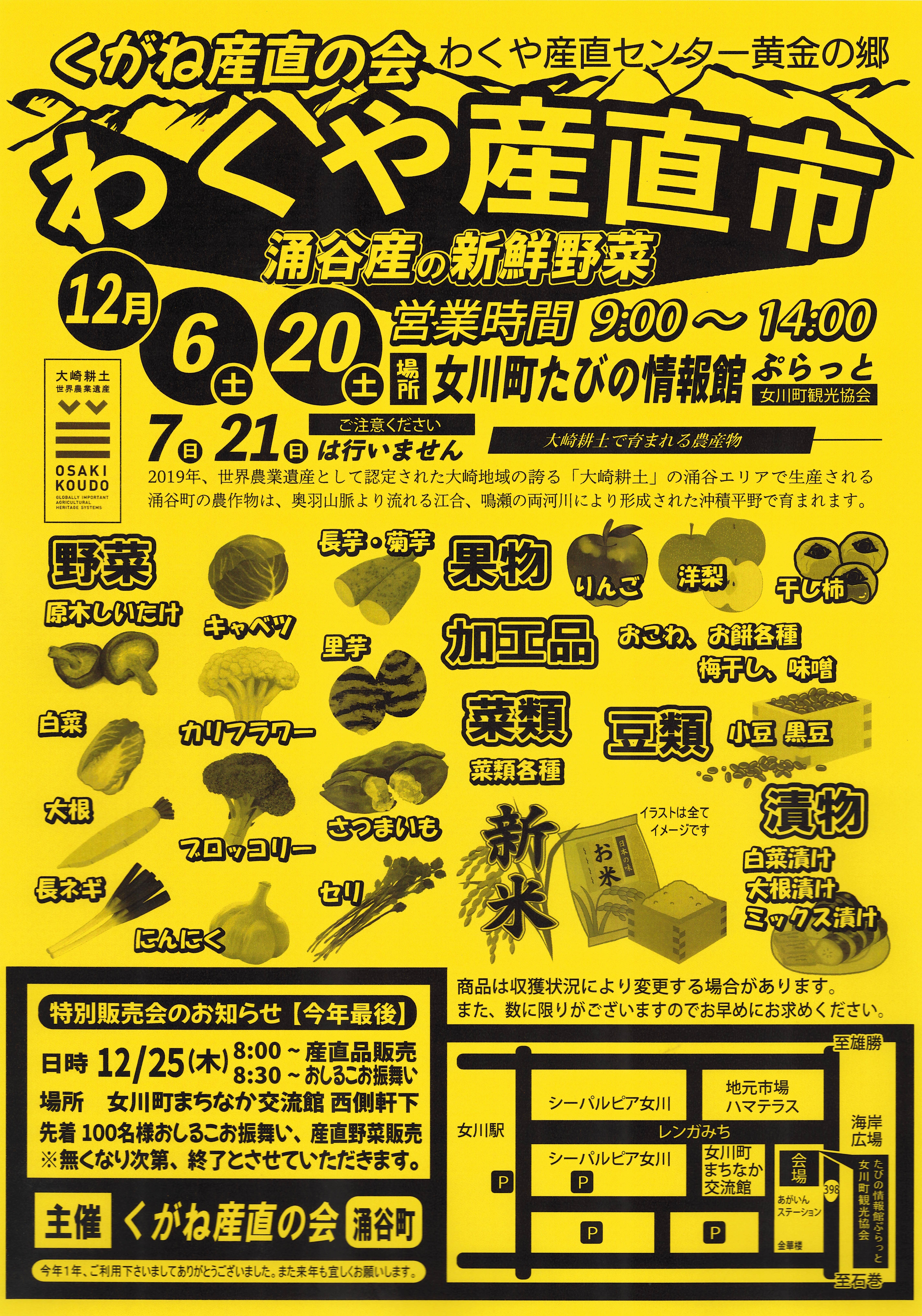 毎回大盛況のわくや産直市! 今月は変則的な日程ですので、ご注意ください。 開催日時 12月6日(土)・20日(土) 9:00~14:00 【※ご注意】 12月7日(日)・21日(日)は行いません。 販売会場 女川…