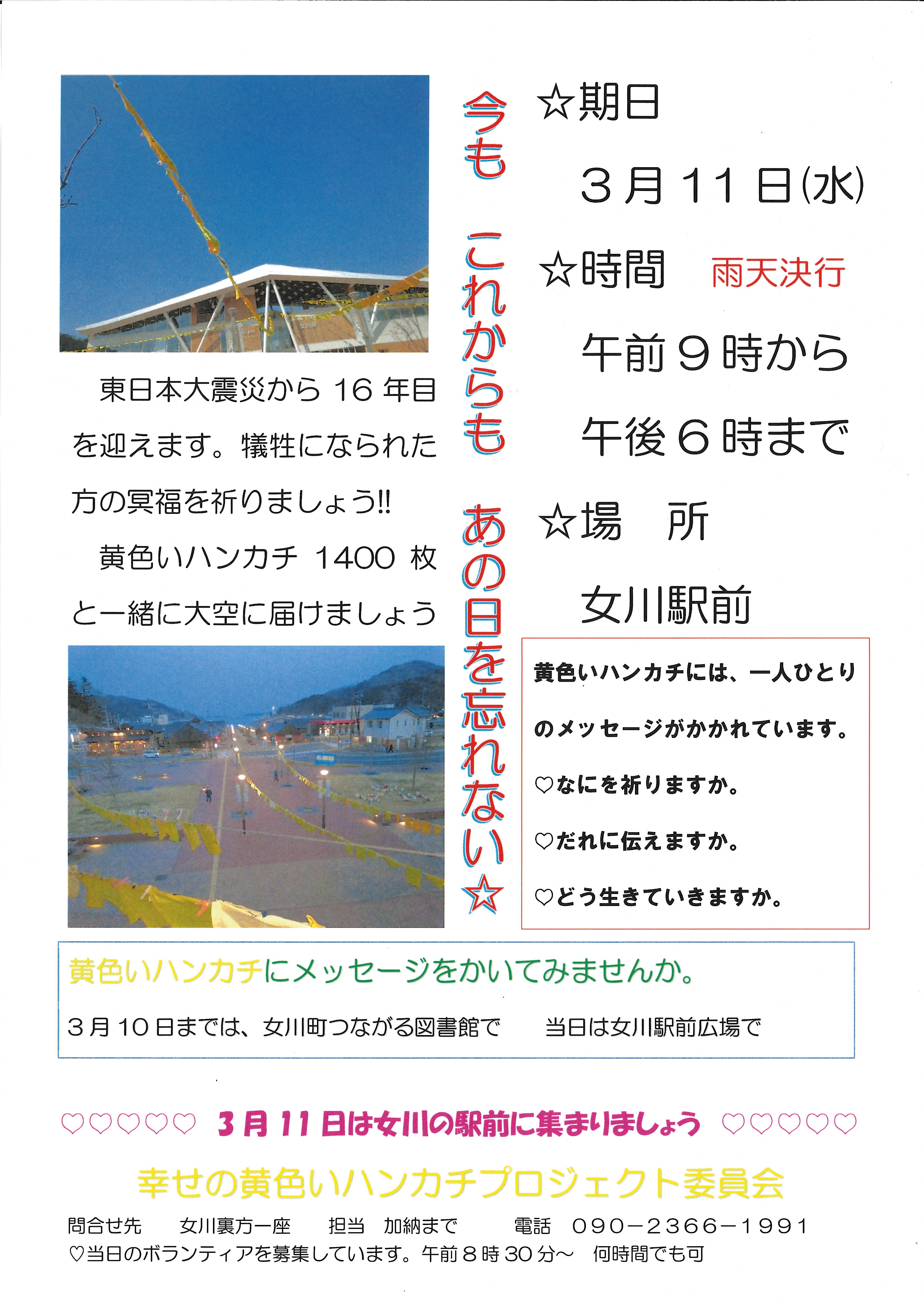 東日本大震災から16年目を迎えます。犠牲になられた方々のご冥福を祈りましょう。 今年も「幸せの黄色いハンカチプロジェクト」が開催されます。 黄色いハンカチには、それぞれのメッセージが込められています。 ・なにを祈りますか…